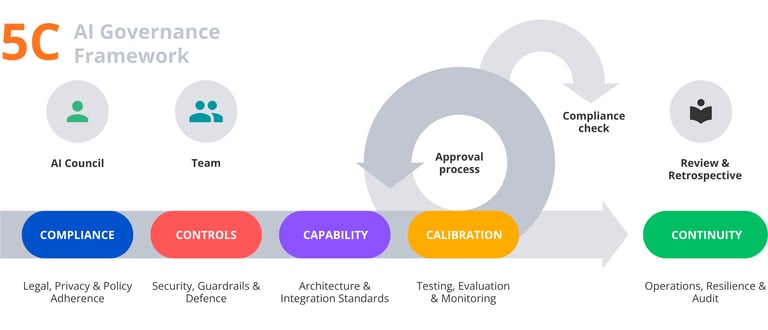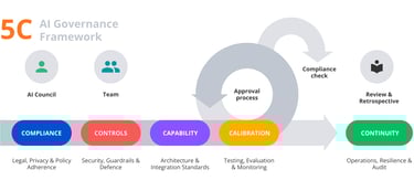 A governance framework covering 5 pillars: Compliance, Controls, Capability, Calibration, and Continuity for all AI systems.